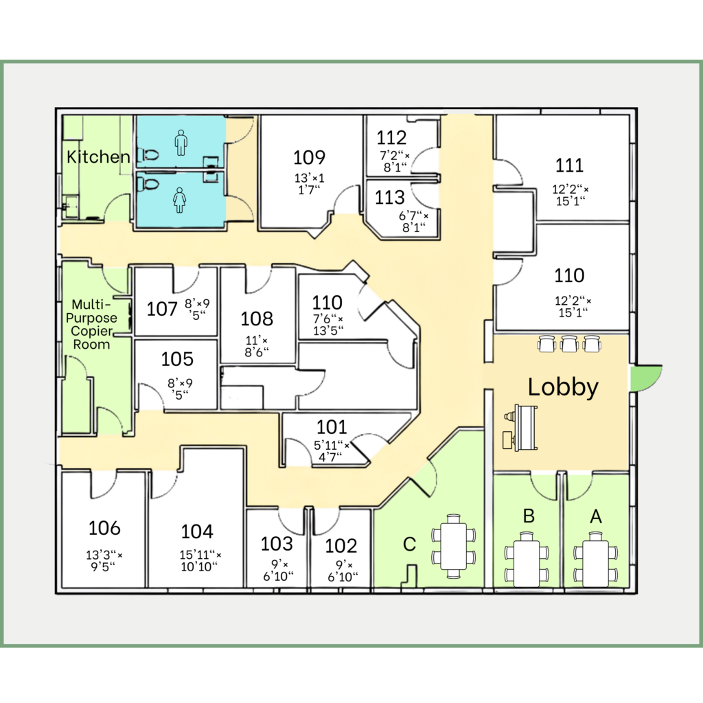 | Suite 109 – Available | 11’6″x10’6″ | $750/month |